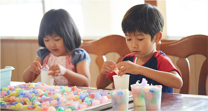 紙コップにキューブ状のろうそくを詰めて、溶けたロウを流し込むとカラフルなキャンドルのできあがり。簡単につくれるので、小さなお子さまでも気軽にチャレンジできます