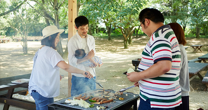 爽やかなこもれびの中、満足度100%のバーベキューをお楽しみください。サイトには屋根があり、雨天でも安心してご利用いただけます。