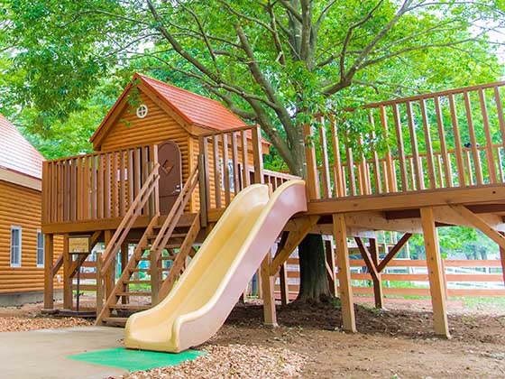 小屋の中や双眼鏡をのぞいてみよう!ウッドデッキの下も探検してみてね!